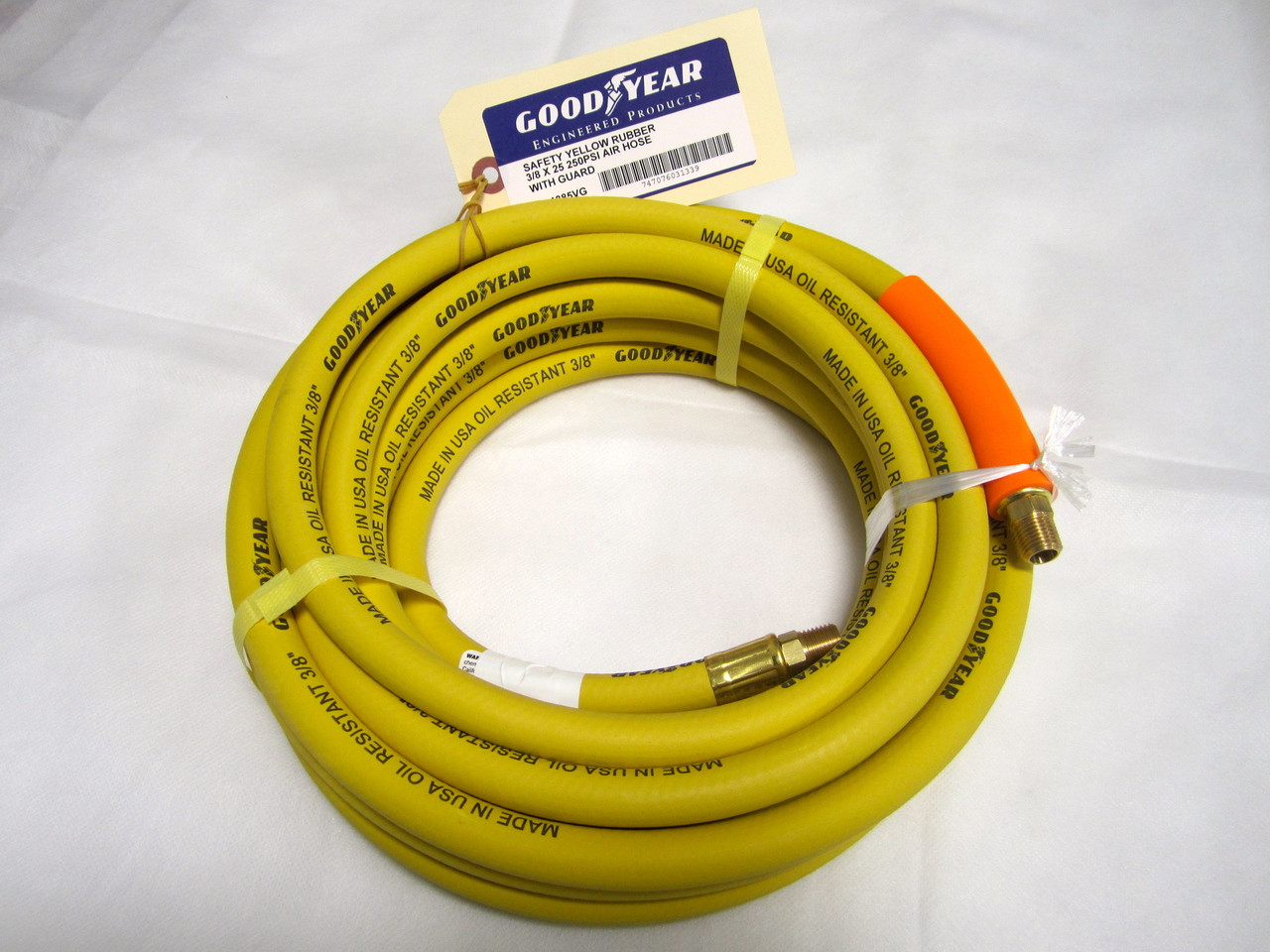 Loading... Please wait...| Sturdy Goodyear 25ft 3/8in. dia. EPDM rubber hose is ideal for use with pneumatic tools, stapler guns, lawn sprayers and air compressors. Features a weather-, oil- and heat-resistant outer coating to survive tough conditions. U.S.A. Features 1/4' npt fittings and is heat resistant from -40 degress to 190 degrees. |